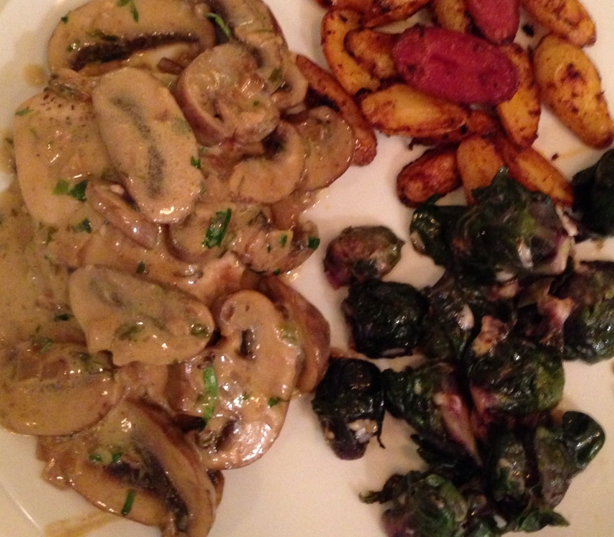 In this case, we served it alongside some great purple sprouts sautéed in garlic, nutmeg and parmesan (purple sprouts – another recent addition to our farmer’s market – wow) and (well)roasted fingerling potatoes we also got at the farmer’s market that morning.