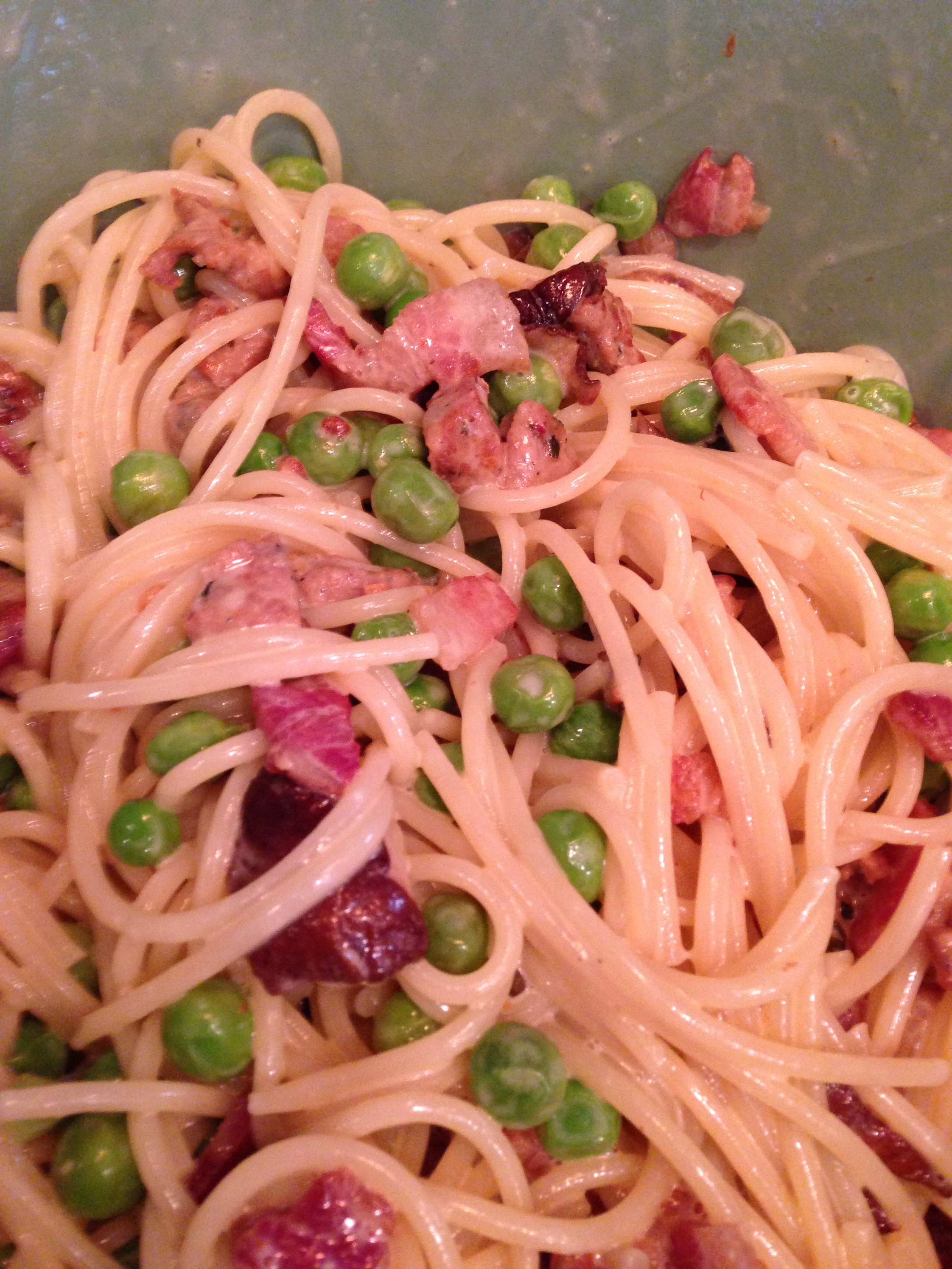 After both are boiled, place the peas into the pan with the garlic and bacon (which, to avoid overcooking should be turned down, but not off – keep it warm/hot). Drain the spaghetti and immediately place it into a ceramic serving bowl.
