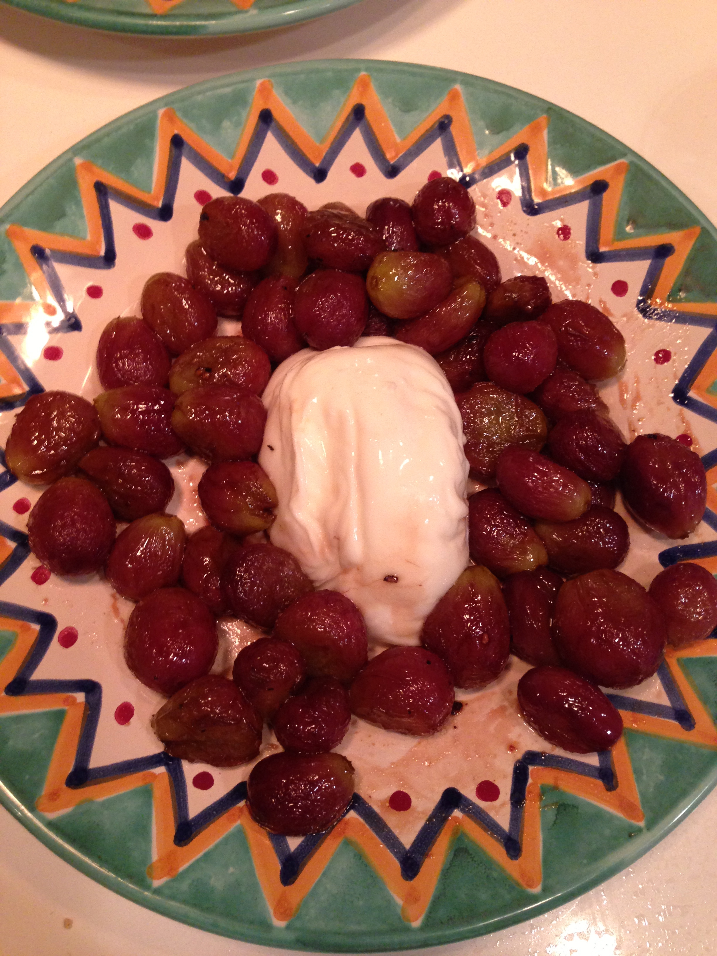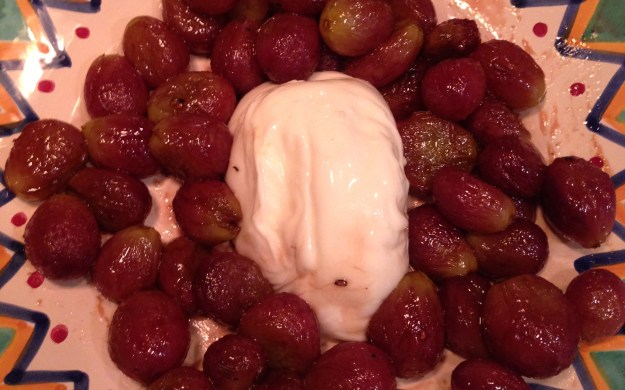 Pull about 1/2 bunch of red grapes off their stems and toss with a little olive oil, balsamic vinegar, salt and pepper. Place on a baking try covered in aluminum foil and put into a pre-heated 375 degree oven. Bake for about 10-15 mins, tossing lightly every 5 mins, until the grape skins just begin to split.