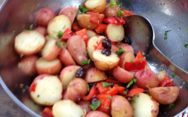 Toss your room temperature potato and dressing mixture with the chopped olives, parsley and roasted red peppers – and serve.