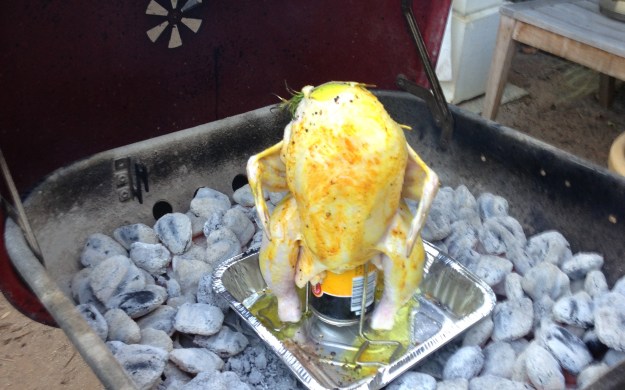 Now, the trickiest part for us is setting this bird-on-a-beer-can into the coals without it tipping over or without burning yourself. You may need help and, if you have them, use some heavy work or fire gloves to protect your fingers. If you’ve “cleared” the center of your circle of coals enough and your chicken is steady, it shouldn’t be too difficult.