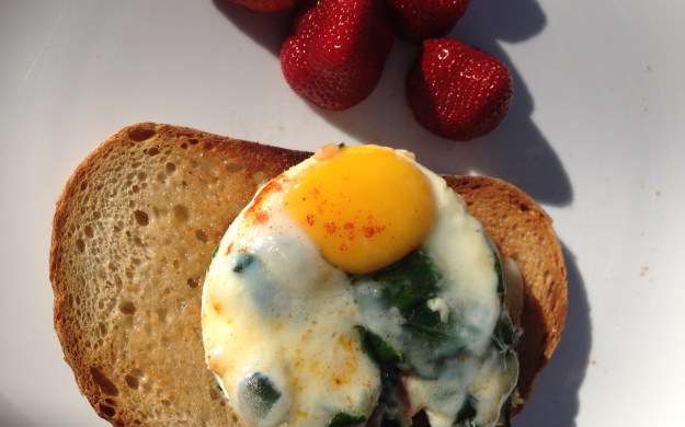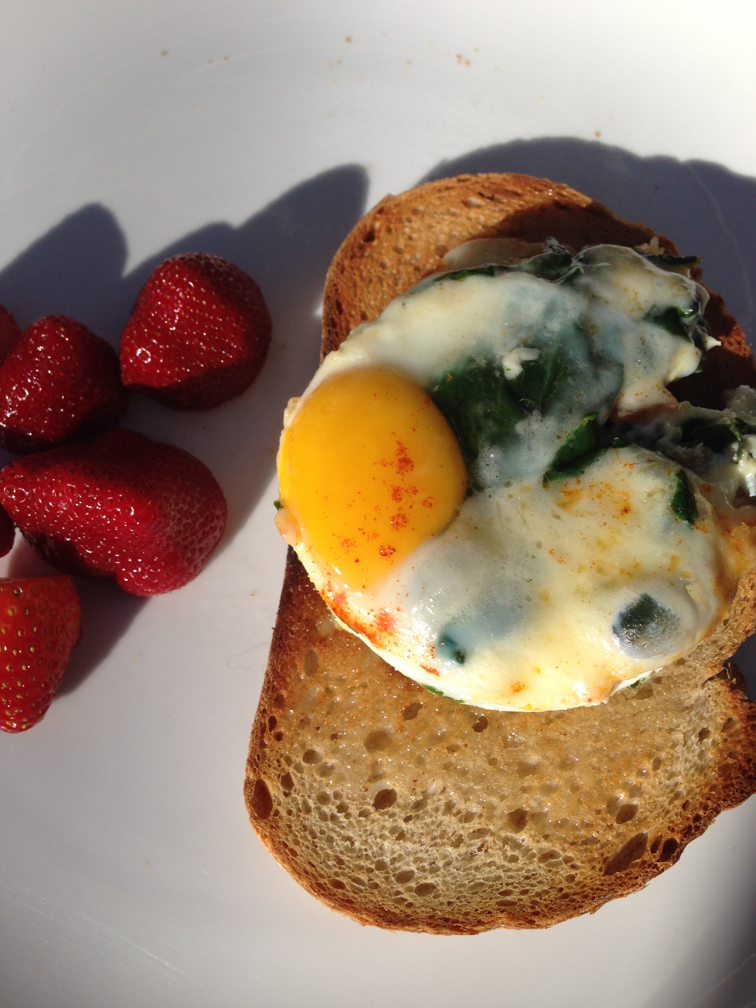 Place a piece of buttered sourdough toast on a plate and with your mitted-hand hold the ramekin. Then, with a butter knife, separate the sides of the egg-spinach mixture from the sides of the ramekin and gently slide the contents onto the toast. Use the butter knife to help coax it along. If you can get it right side up on the toast, you’re a star – but don’t worry if it turns over – it still tastes great any way around.