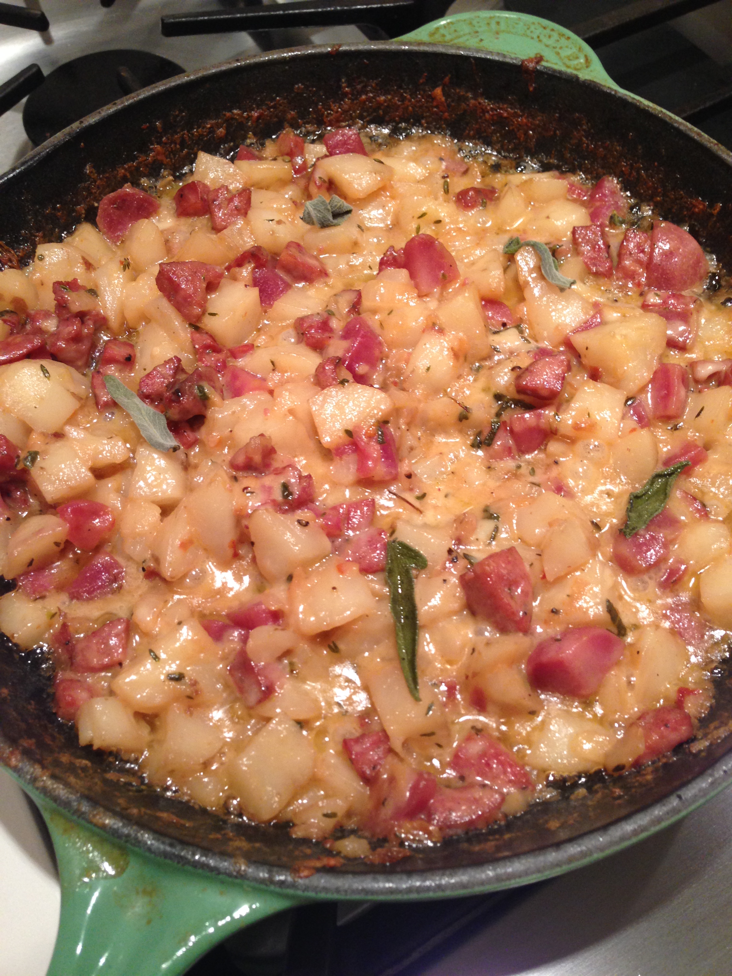 It uses about a pound of sunchokes, 2-3 sausages (we used a chicken/garlic sausage, but any will do), 1/2 small onion, 2 cloves garlic, 1 to 1-1/2 cups white wine, fresh thyme, fresh sage, 1/2 cup heavy cream and 3/4 grated parmesan cheese. Olive oil, butter and salt & pepper.