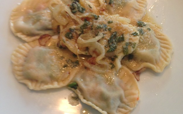 Add the raviolis quickly to the butter mixture, stir to coat, remove and serve – with sauce spooned over the top. You can add a sprig of parsley or a few leaves of sage as a nice garnish and some shaved parmesan.