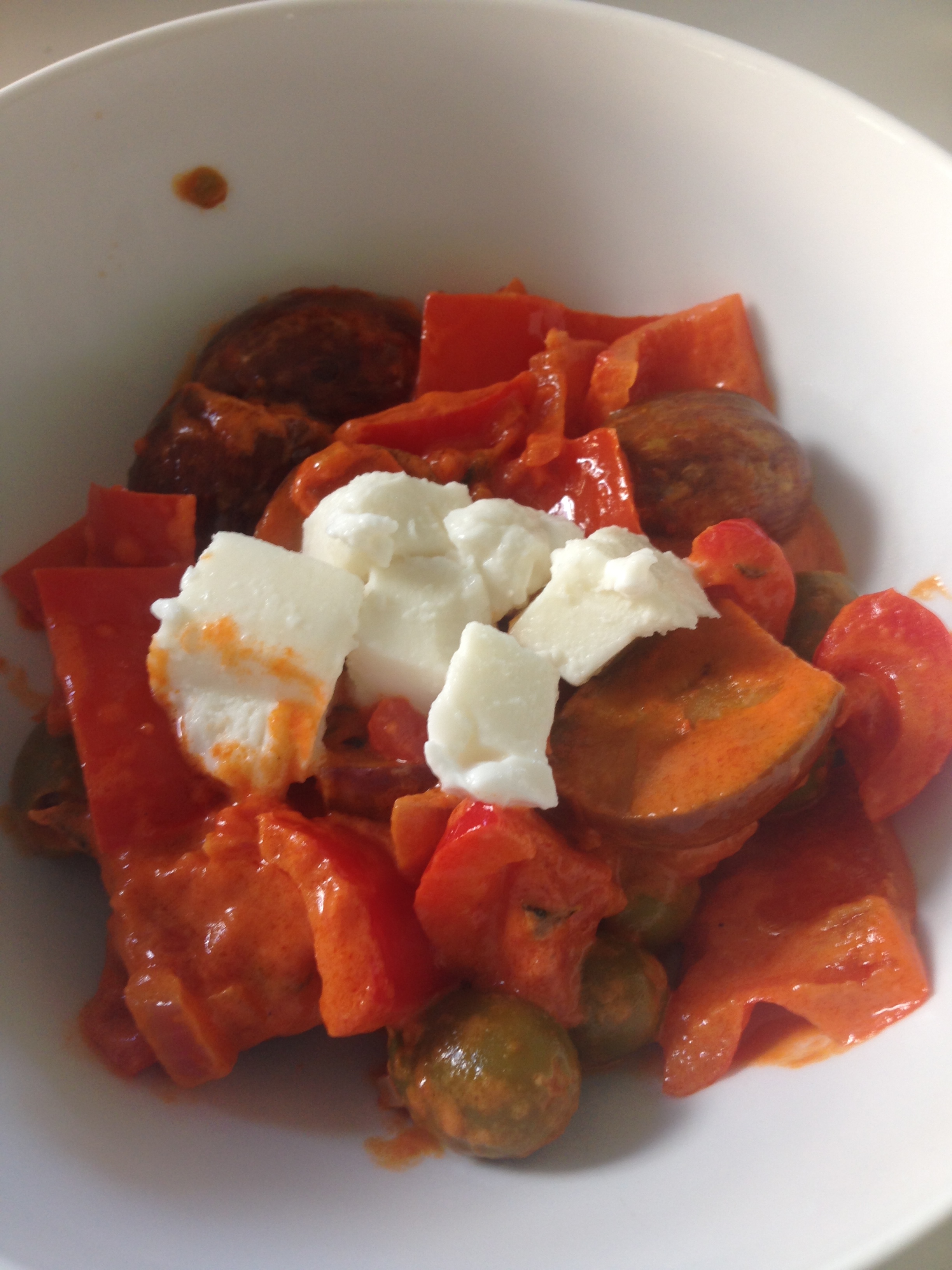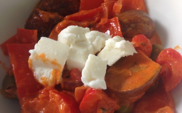 This is a great mid-week dinner which was cribbed (again) from Jamie Oliver. It takes a lot of what you may already have in your kitchen and makes it into a hearty and tasty tomato-based stew.