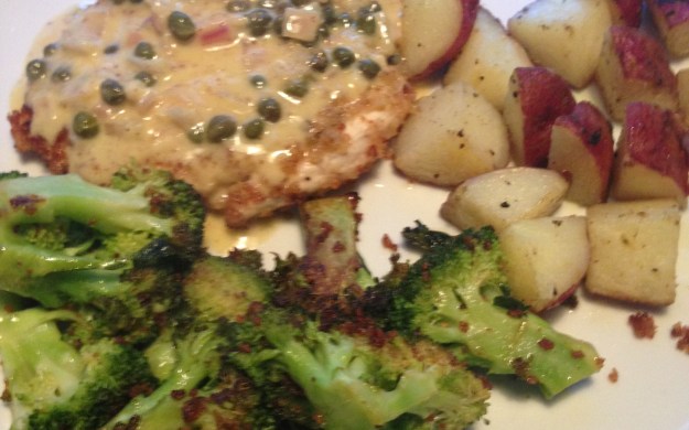 For two people you’ll need: 2 chicken breasts, the juice of one lemon, 2 Tbsp capers, 1 large shallot (chopped), 2 cloves garlic (crushed and chopped), 1 cup panko bread crumbs, 2 Tbsp unsalted butter, 1 Tbsp dijon mustard, 1/3 cup heavy cream, 1/3 cup white wine, about 1/2 cup olive oil and 1/4 cup veg oil, salt and pepper. (Broccoli and Potatoes optional)