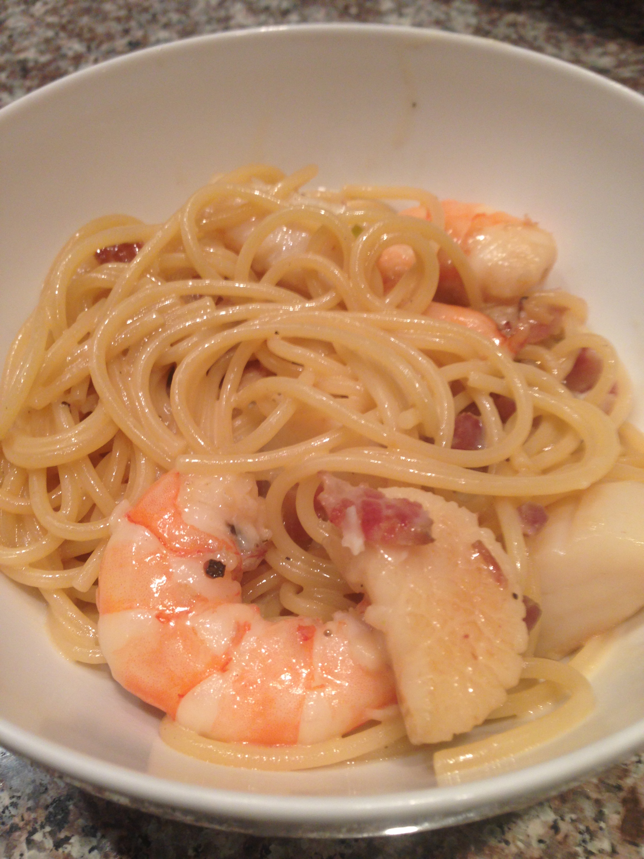 You’ll need 1/3 to 1/2 lb fresh shrimp (peeled and deveined), 1/3 to 1/2 lb bay scallops (cut in half), x3 strips bacon (cut into small pieces), x2 garlic cloves (crushed and coarsely chopped), 1/4 cup heavy cream, 1/4 cup shredded parmesan, x1 egg, juice of 1/2 lemon, spaghetti, olive oil, salt and pepper.