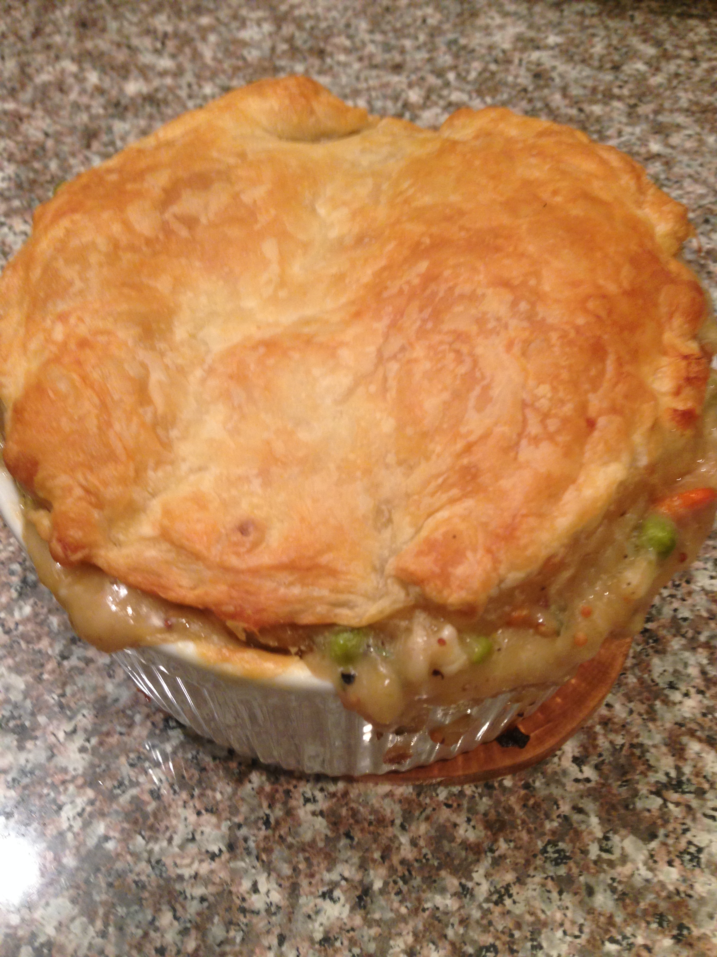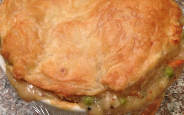 First, pre-heat the oven to 400. Spread out two sheets of pre-made puff pastry (we used Pepperidge Farms) on a large, floured surface. Roll the sheets with a floured rolling pin until they about 1/2 the thickness. Lightly grease a deep ceramic baking dish – about 6-9″ in diameter and 2-3″ deep – with unsalted butter. Place one of the sheets over the greased ceramic dish and gently press into the sides and edges, letting some of the pastry fall over the top edges of the dish. Prick a few small holes into the bottom of the pastry.