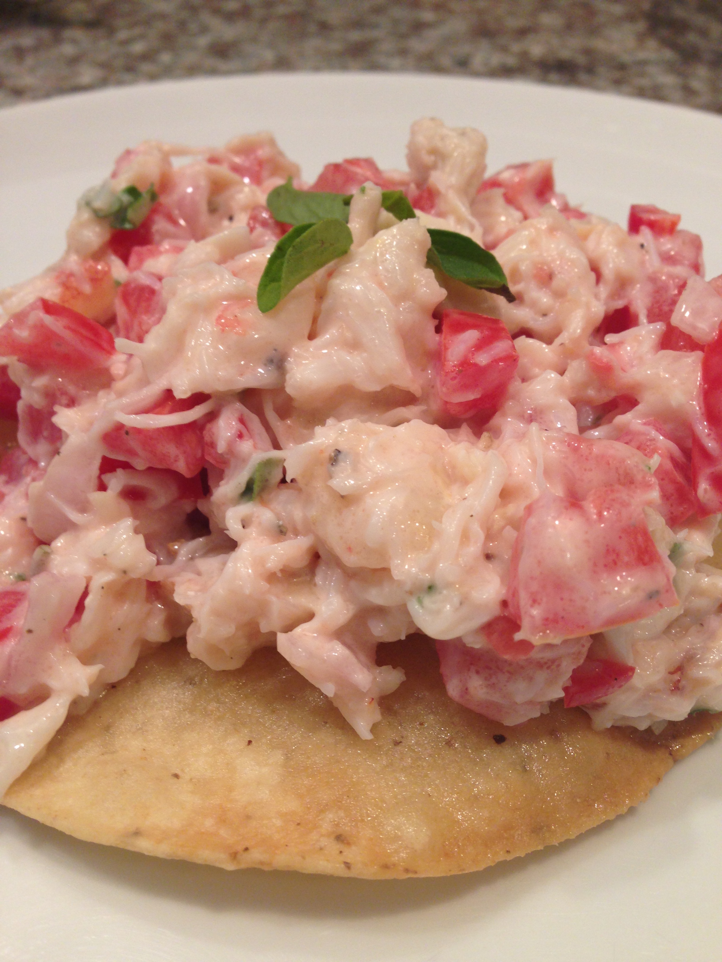 Depending on whether you want this as a main course or just on smaller shells as an appetizer will depend on whether these amounts will serve 2 or 4 people – but you’ll need: 8 oz lump crab meat (pre-cooked), x2 chopped Roma tomatoes (with seeds removed), 1.5 Tbs mayonnaise, 2 Tbs finely chopped red onion or shallots, 1 red chile or jalapeno pepper (seeded and finely chopped), 1/4 cup fresh chopped cilantro or chopped oregano, 2 Tbs lime juice (or the juice of x1 fresh lime), Salt & Pepper, x4 corn tortillas (or pre-fried tostada shells if you want to avoid the frying).