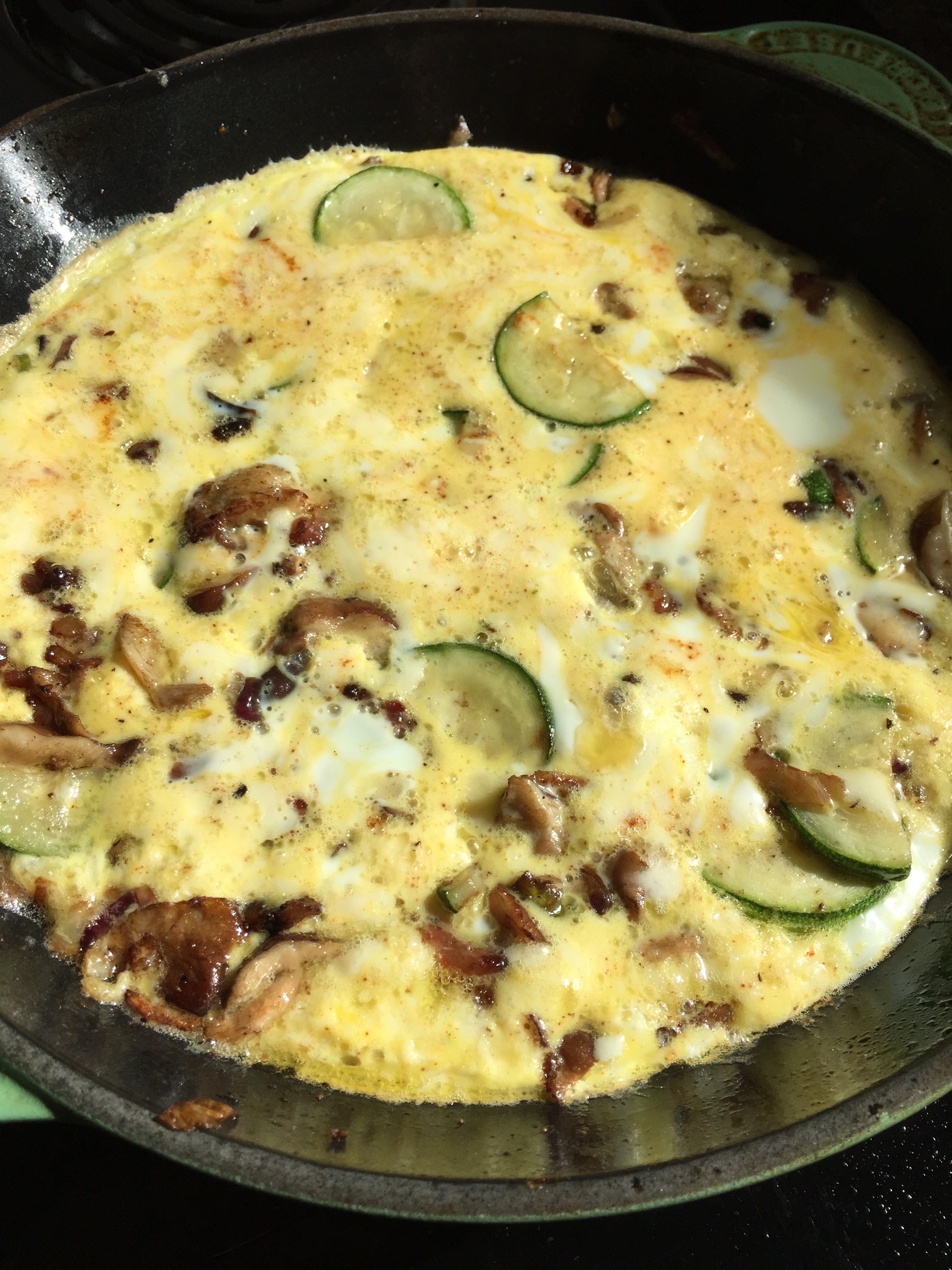 Using a 10″ iron skillet, you’ll need 3 large eggs, 1 Tbsp heavy cream, 2 Tbsp grated cheese (we used sharp cheddar and mozzarella), 3 strips of bacon (chopped), 1/2 zucchini (chopped into half-moon slices), 1/2c chopped mushrooms (we used shiitake), 1 small chopped onion (we used small red onions), paprika, salt and pepper.