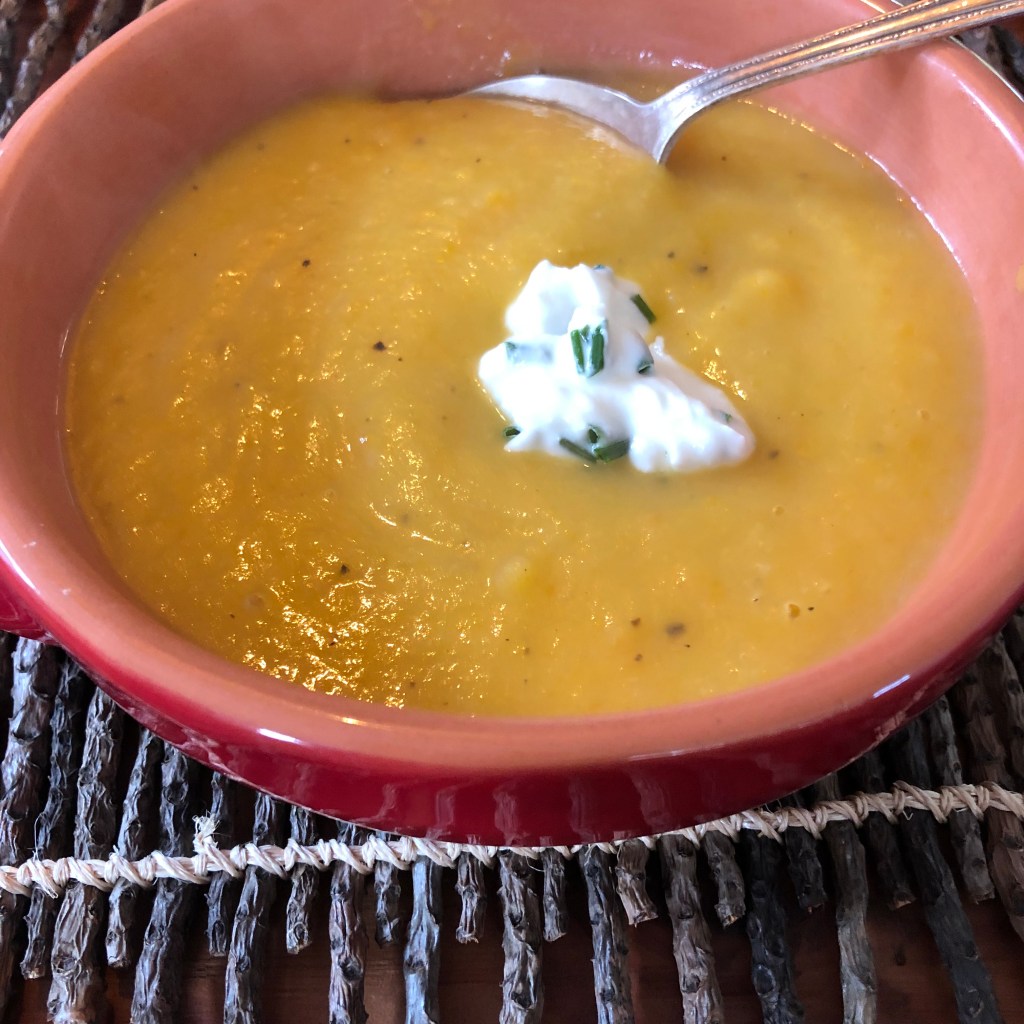 For this you’ll need: 2 Tbsp unsalted butter, 1 large onion (peeled and chopped), 1 large leek (chopped), 3 cups chicken broth, 6 large carrots (peeled and chopped), 2 large potatoes (peeled and chopped), 1 pinch of cayenne pepper, 2 Tbsp fresh ginger (peeled and chopped), 1/2 cup plain Greek yogurt, 1/4 cup chopped fresh chives, salt & pepper.