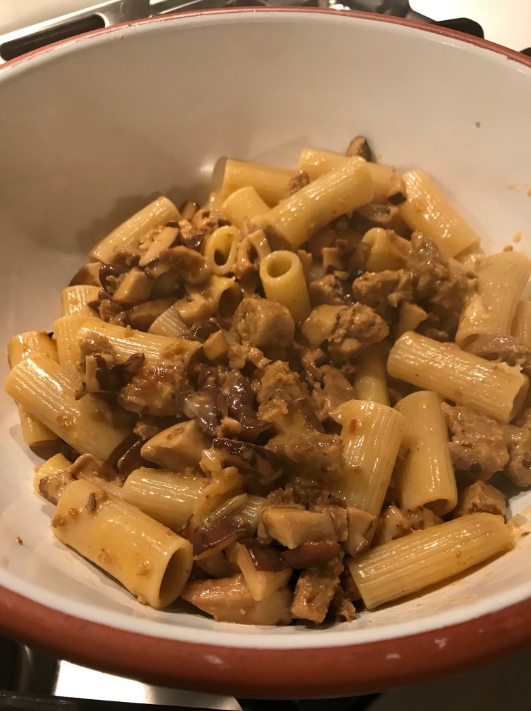 For 2-4 servings you’ll need: 1/2 lb rigatoni pasta, x2 Italian (Beyond) sausage (cut in half and then sliced into 1/4″ pieces), 1/2 lb shiitake or other wild mushrooms (sliced and chopped to your liking), x2 garlic cloves (crushed), 1/4 cup grated parmesan cheese, 2 Tbsp unsalted butter, olive oil, salt and pepper.