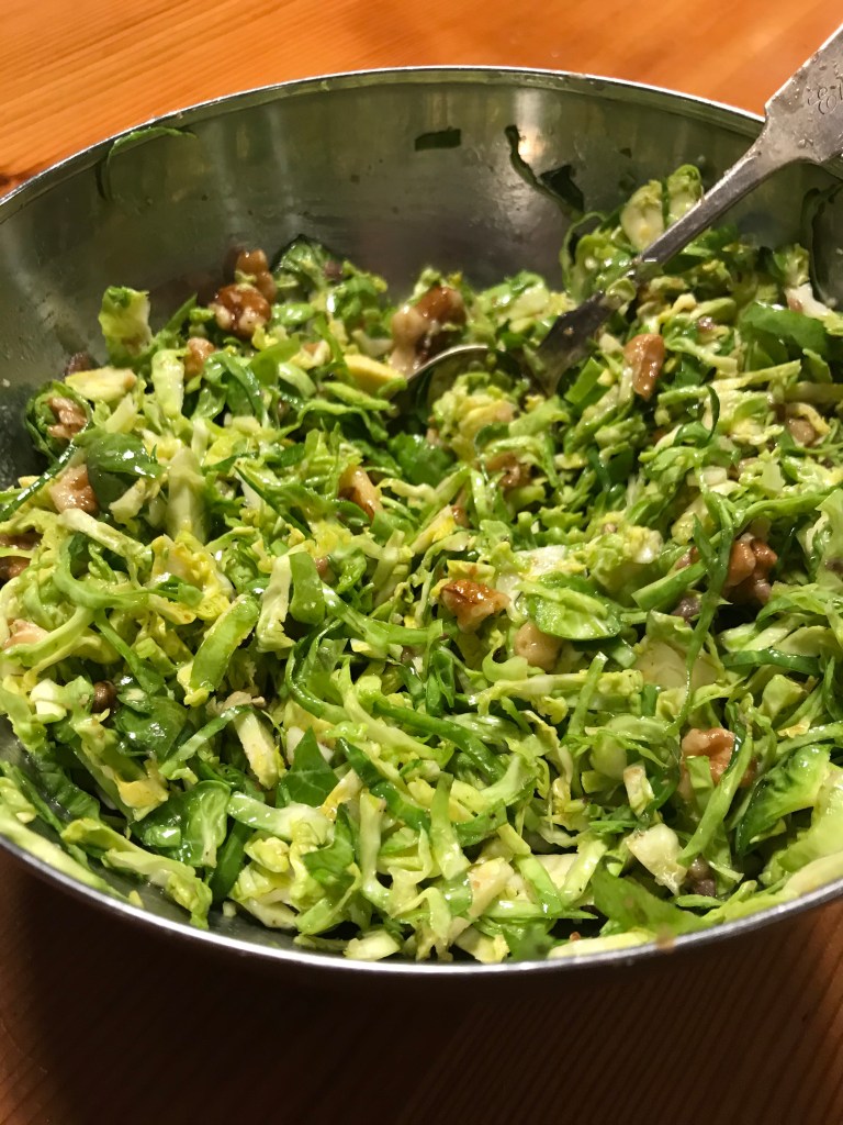 For a medium bowl you’ll need: 1/2 lb brussels sprouts (thinly sliced, see below), 1/2 cup walnuts (roasted then crushed see below), 1 garlic clove (crushed and diced), 3-4 anchovy fillets (chopped, mashed), juice of x1 medium lemon, 1/4 cup parmesan or romano cheese (finely grated), olive oil, salt and pepper.