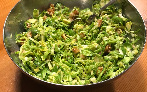 Once the shredded sprouts have filled your selected bowl to your satisfaction, squeeze the lemon juice over the top (be careful to remove seeds beforehand, if possible, or pick them out of the salad). Gently toss the salad to completely cover all of the shredded sprouts – you can do this with a wooden spoon or with your hands.