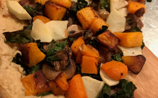 Add a layer each of caramelized onions, mushrooms, roasted squash, sliced apple and the raw, chopped kale.