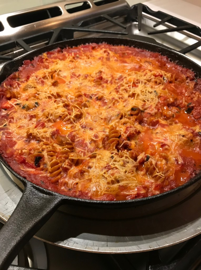 For a 12″ cast iron skillet you’ll need: x2 (vegan) Italian sausages (cut into 1/2″ pieces), x1 red bell pepper (cored and cut into 1/2″ squares), x4 garlic cloves (crushed and chopped), x1 shallot (peeled and chopped), 1 tsp crushed red pepper, 2-3 Tbsp fresh oregano (chopped), 1-2 Tbsp basil (dried or fresh, chopped), x2 14 oz cans of crushed tomatoes, x2 medium-sized fresh tomatoes (chopped), 1 package pasta (ziti or similar), 1-2 cups (vegan) mozzarella, 1 cup (vegan) parmesan, olive oil, salt and pepper.