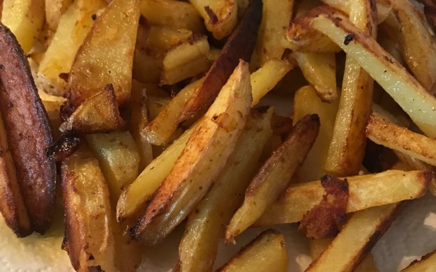 For this we used x3 or 4 Yukon Gold potatoes (skins left on but cut into 1/4-1/2″ thick slices, don’t make them too thick), 2 Tbsp vegetable oil, 2 Tbsp coconut oil, 1 tsp garlic powder, 1/2 tsp paprika, 1 tsp salt, 1/2 tsp pepper (you can also add chopped fresh rosemary to this as well).