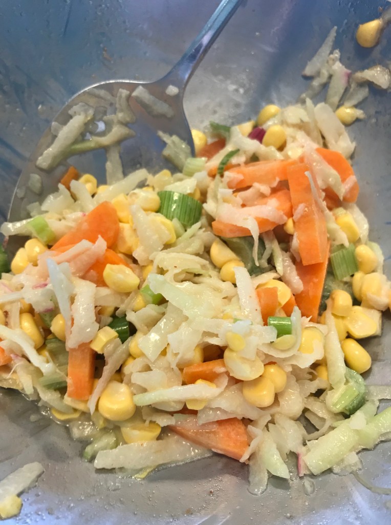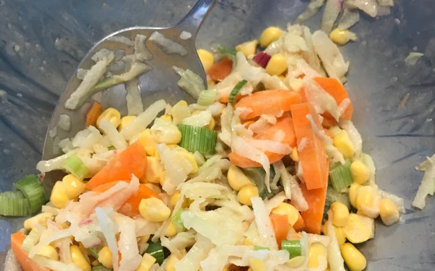 For this you’ll need: 1 kohlrabi bulb (stems removed and peeled), 1 carrot (peeled and chopped), 2-3 spring onions (chopped), 1 ear corn (just the kernels removed with a sharp knife), 1 Tbsp mayonnaise, 2 tsp BBQ sauce (optional), 1 Tbsp white wine or tarragon vinegar, salt.