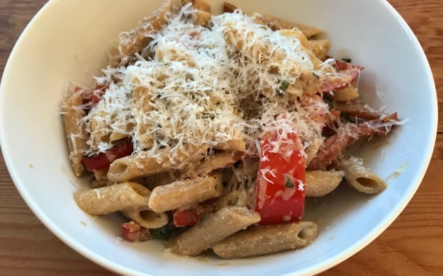 Drain the pasta, reserving about a cup of the cooking water, and add it directly to the bowl with the ricotta and scallions and mix well – coating all of the pasta. Add in the fresh basil and combine again. Lastly, add in the peppers with all of the cooking juices and stir well again. Add a little pasta water to loosen the sauce up a little – use your judgement adding just a bit at a time.