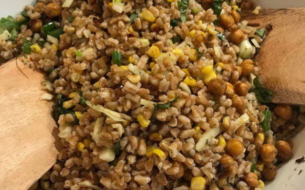 Add the browned kernels, chopped basil, sliced scallions and thinly sliced fennel to the now room temperature farro and toss well to combine. Add a splash more of olive oil, cider vinegar and/or salt to adjust for taste.