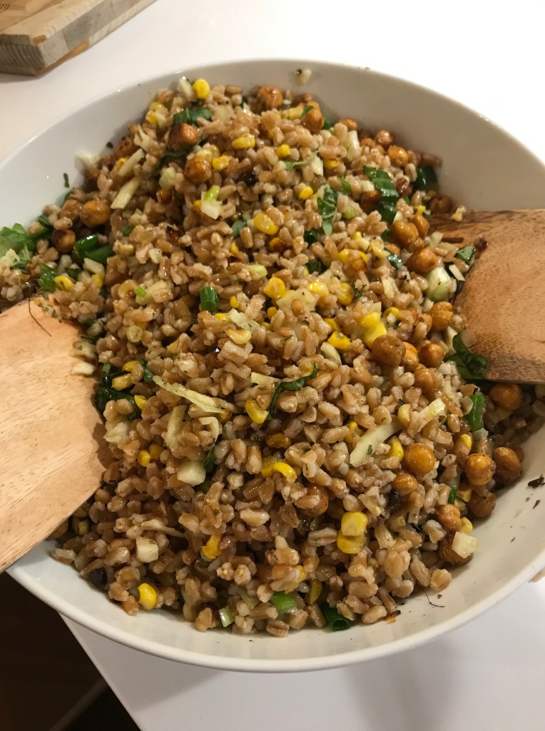 For a large bowl you’ll need 1-1/2 cup uncooked farro, x1 15oz can of chickpeas, x2 ears of corn (kernels cut from the ear lengthwise), 3-4 scallions (roughly chopped, some green included), 1/2 bulb fennel (thinly sliced), 1/3 cup fresh basil (chopped), x2 bay leaves, 3-4 whole sprigs fresh thyme (plus another 2-3 springs for removing the leaves), 1-2 tsp cumin, 1/2 tsp allspice, 2 Tbsp apple cider vinegar, olive oil and salt.