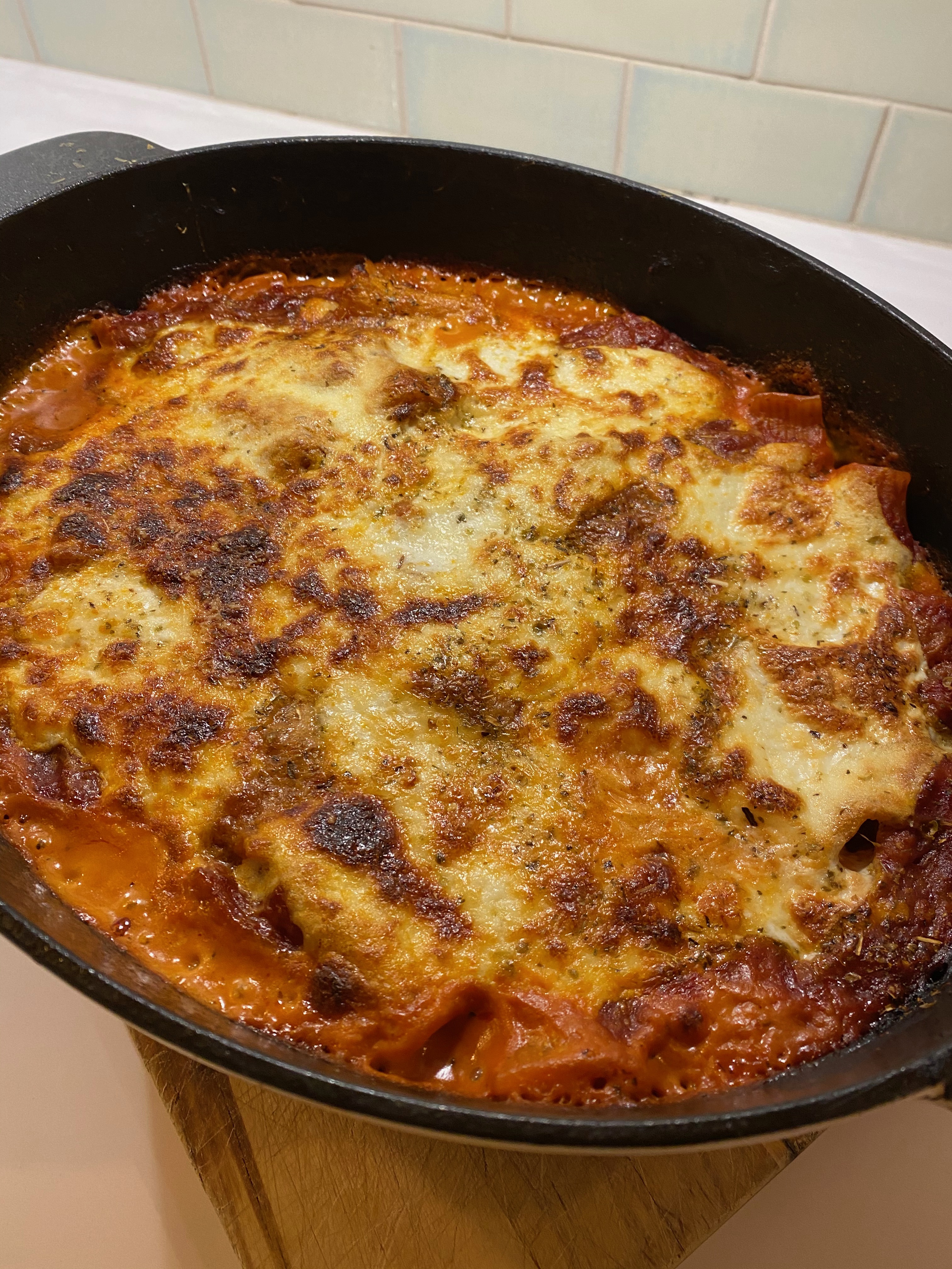 Once again we went to the archives of NYTimes Cooking (Alison Roman) for a filling comfort food on a cold rainy autumn night. This version takes a bit of time but the depth of flavor is worth it. The real trick is cooking the pasta just enough that it isn’t fully done but won’t overcook when baked for 30 mins. Generally that works when you shave off about 2 minutes of boiling time and rinse with cold water once you’ve strained it.