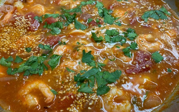 For this you’ll need: x1 medium red onion (chopped), x1 14oz can whole tomatoes, 1 tsp brown sugar, 3/4 tsp ground cumin, 1/2 tsp caraway seeds, 1/4 tsp ground allspice, 2 Tbsp fresh dill, x3 garlic cloves (crushed & chopped), x1 jalapeno pepper (chopped), 3 Tbsp sesame seeds, 1 lb raw shrimp, 2 Tbsp fresh parsley (chopped), 2 Tbsp + 1 Tbsp olive oil, salt and pepper.