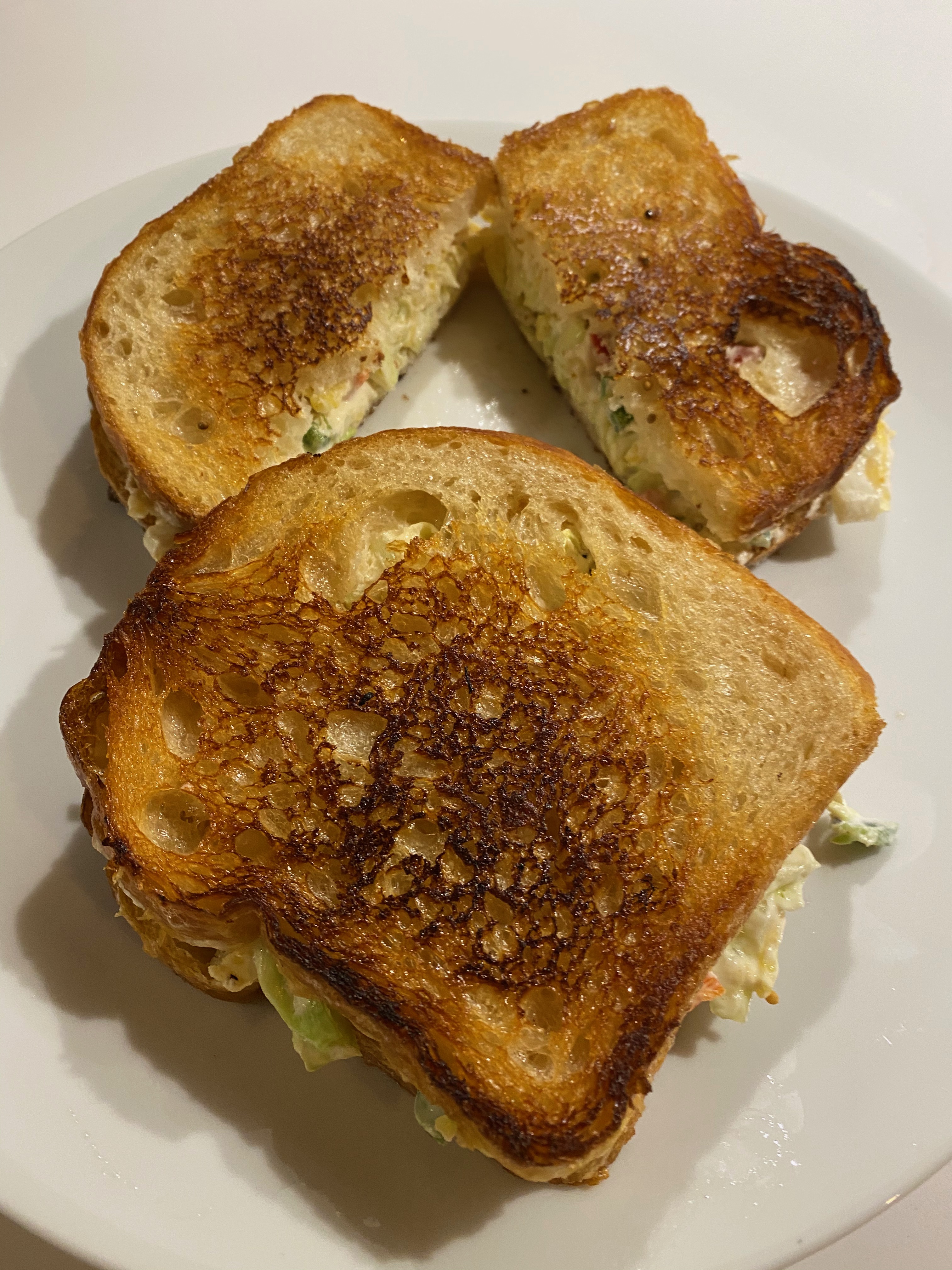Lay out x2 slices of bread on a cutting board and liberally spread the veggie/yogurt mixture out on top of them. Place the second slices on top and set aside.