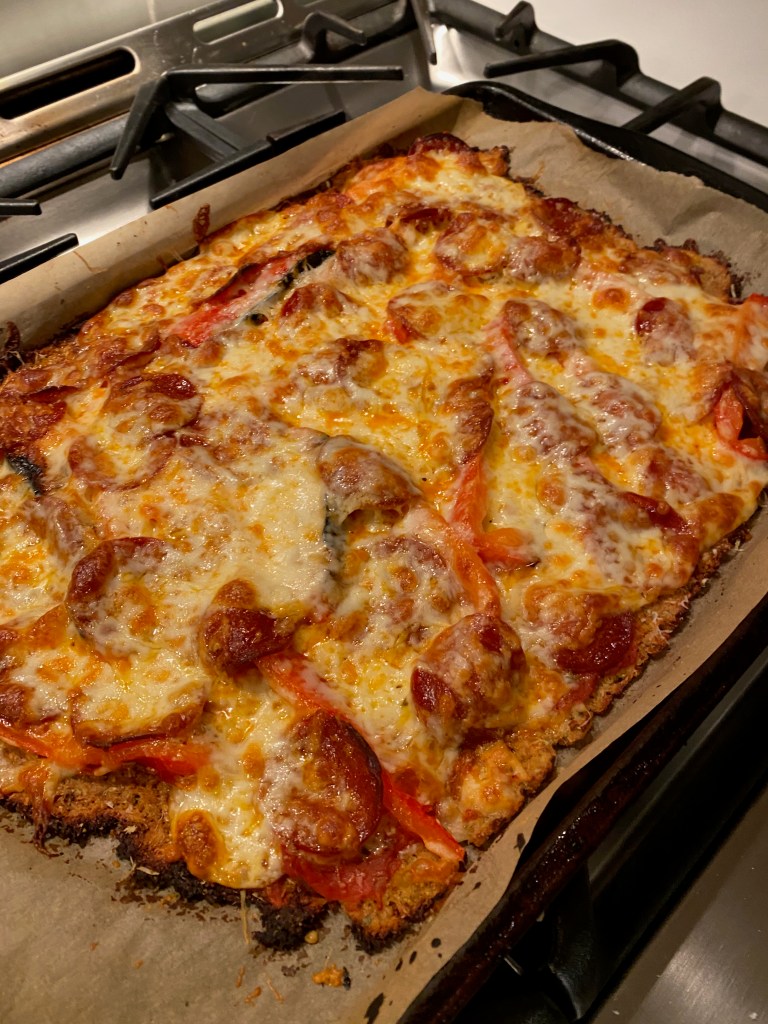 We’ve been playing around with different methods of creating a cauliflower pizza crust. This includes when to steam, if to steam, when to food process and how far to process…the list goes on. So far, this recipe has led to the best results. Making the cauliflower into a “meal” with a food processor prior to baking it means that it will dry itself out – the opposite of which happens with steaming – something that is critical to the crust holding together into holdable slices. We also decided to place this onto a baking tray rather than a pizza tray as that allows a little more control and lets the edges stay a little thicker so it reduces the chance of burning around the rim.