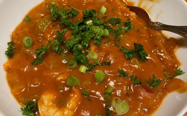 For 4 servings you’ll need: 1/2 stick unsalted butter, 1/3 cup flour, 1 medium onion (finely chopped), 1 green pepper (cored, seeded and chopped), 2 celery stalks (thinly sliced), 1 lb shrimp (peeled and deveined), 4 garlic cloves (peeled, crushed and chopped), 1 15oz can of tomato sauce, 1 tsp sugar, 1/2 tsp dried thyme, 1/2 tsp dried basil, 1/2 tsp dried oregano, 2 bay leaves, 3 scallion (chopped), handful of fresh parsley (chopped), salt and pepper. For the Creole Spice mix: 1 Tbsp smoked paprika, 1 Tbsp chili powder, 1 tsp onion powder, 1 tsp garlic powder, 1/2 tsp cayenne pepper, 1/2 tsp sea salt, 1/2 tsp black pepper.