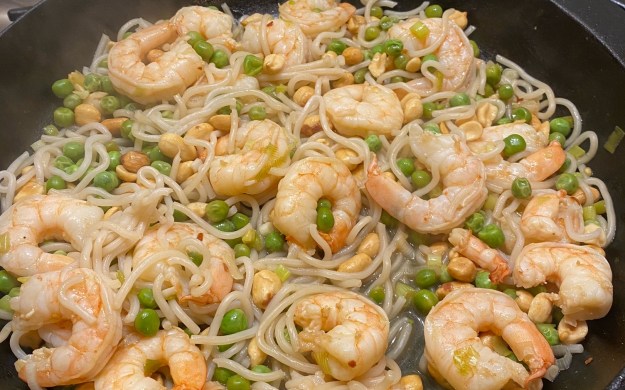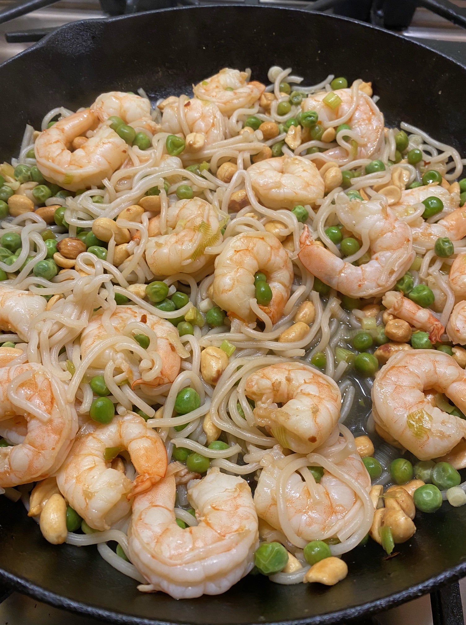 For this you’ll need: 1 lb raw shrimp (peeled & deveined), x1 package of Hokkien noodles, x2 Tbsp brown sugar, x2 Tbsp fish sauce, x2 Tbsp white vinegar, 3/4 cup frozen peas, 4-5 scallions (chopped), 2 Tbsp lime juice, 3 Tbsp roasted salted peanuts, 1/2 tsp crushed red pepper.