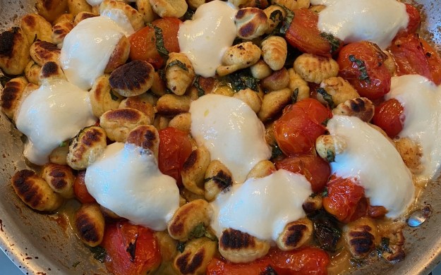For this you’ll need: x2 packages of potato gnocchi (usually refrigerated), 2 Tbs olive oil, x4 garlic cloves (sliced thin), 1/2 stick of unsalted butter, 2-3 cups cherry or grape tomatoes, 1/4 tsp red pepper flakes, 1/4 cup fresh basil (thinly sliced), 8 oz fresh mozzarella (shredded into smaller pieces), salt and pepper.