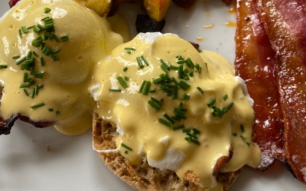 In the meantime, toast the muffins and cook your bacon. Butter the muffin and place two half slices of bacon on top. Remove the poached eggs with a slotted spoon and place on top of the bacon/muffins. Spoon the sauce over the top and cut the fresh chives onto the surface. Add a small grind of salt and pepper.