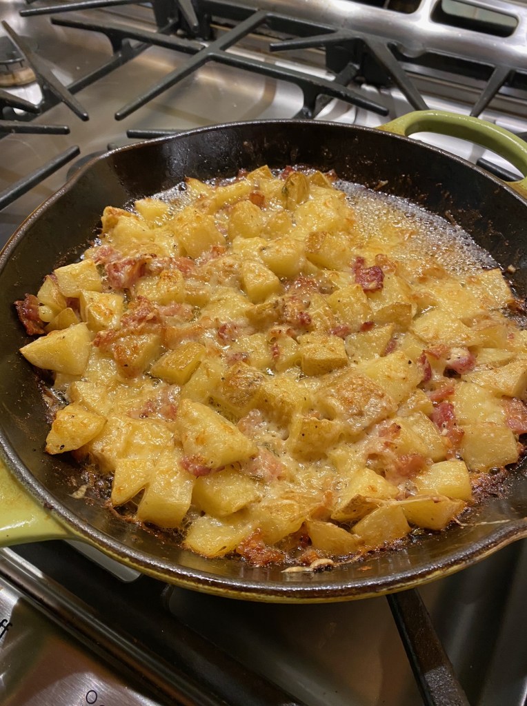 This is an adaptation of a Tartiflette recipe from Melissa Clark in NYTimes Cooking. The real difference is the lack of fancy cheese and creme fraiche. But it still tastes great and works well with scrambled eggs and toast. We used parmesan cheese, but we’re sure cheddar or brie could work just as well. In addition, using a chicken or veggie stock instead of the wine would work as well. Doing this in a step by step manner adds flavor, so take the time.
