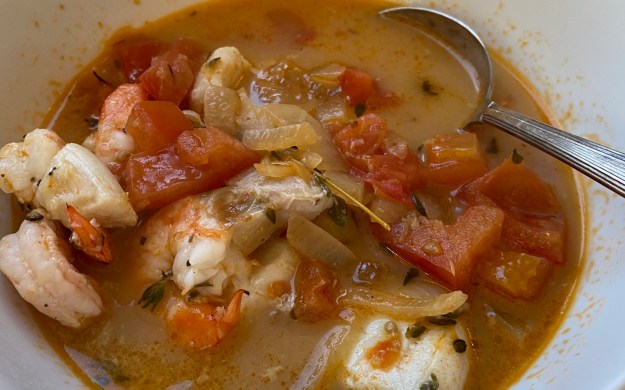 This was a very flavorful and satisfying stew that can be augmented by other additions – e.g. we used shrimp, scallops and haddock but clams and other types of fish could be used. Cooking the (shell)fish separately helps to bring an added element to the flavor since they marinate and steam themselves outside of the stock base. It’s worth the extra step to have that. This comes from David Tanis in NYTimes Cooking.