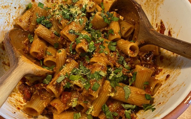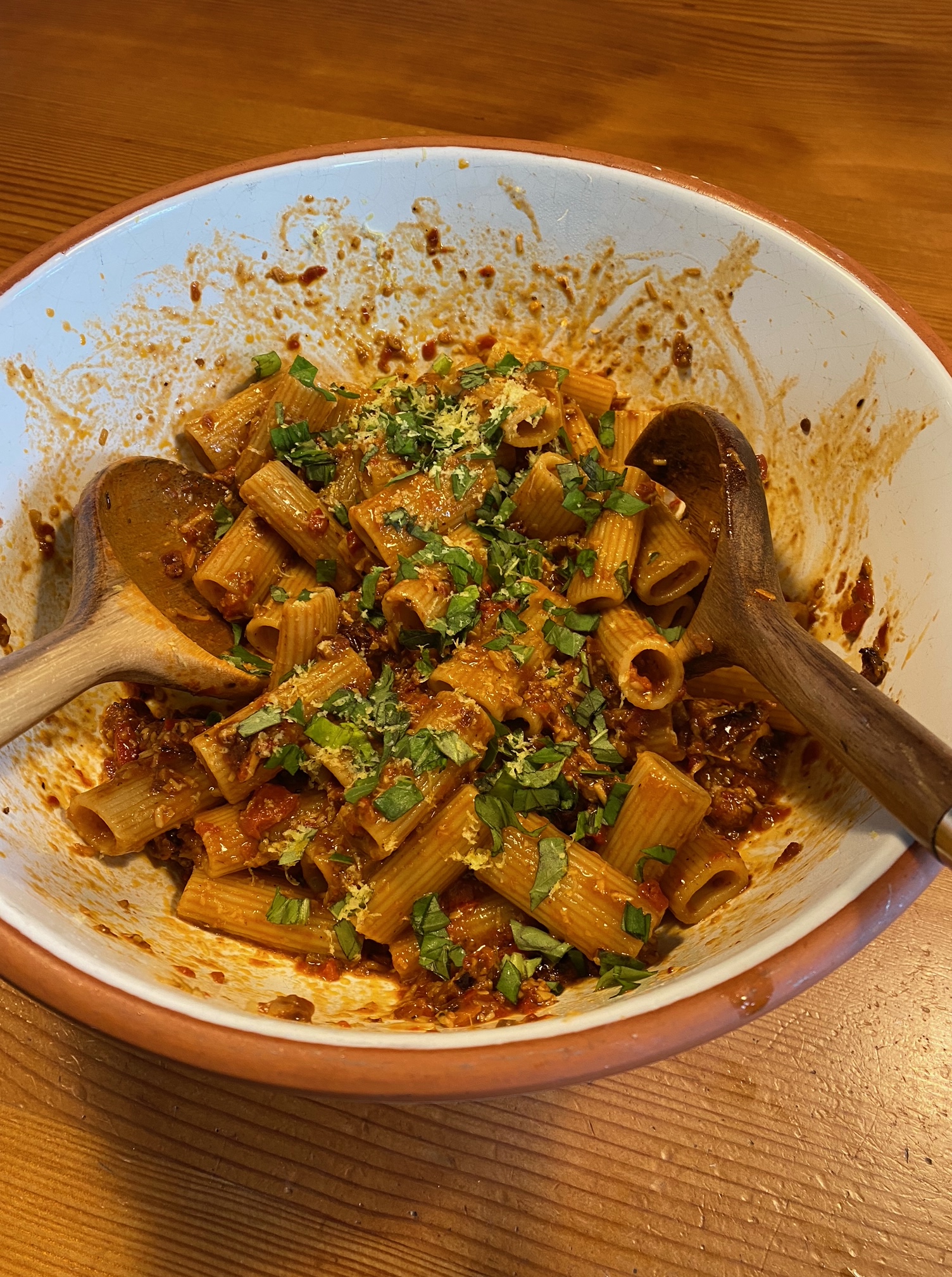 For this you’ll need: 1 lb rigatoni pasta, 1/3 cup plus 1 Tbsp olive oil, 1/2 cup sun dried tomatoes (jarred in oil, drained and roughly chopped), 1/2 cup walnuts (shelled and roughly chopped), 3 Tbsp tomato paste, 3 cloves garlic (chopped), 1 tsp red pepper flakes, 1/2 cup roasted red peppers (jarred in oil, drained and roughly chopped), parmesan (grated), fresh basil (chopped), 1 Tbsp grated lemon zest, salt and pepper.