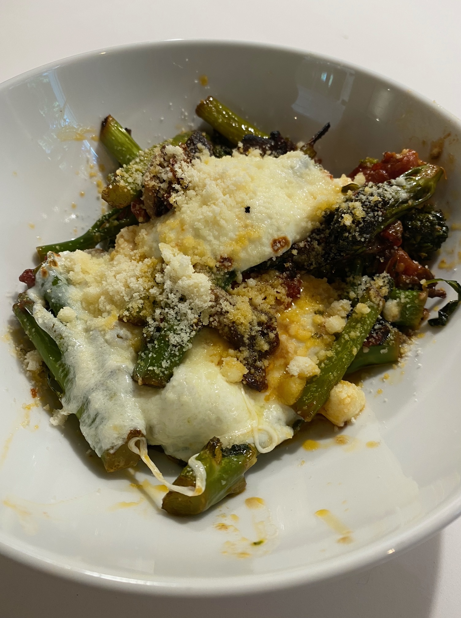 For this you’ll need: x2 bunches of broccolini (dried stem-ends trimmed and then cut into smaller, 1-2″, pieces), x1 15 oz can of whole tomatoes (drained and roughly cut), x3 cloves garlic (peeled and crushed with the wide side of a knife), 6-8 anchovy fillets, 1/2 tsp crushed red pepper, 1/2 lb fresh mozzarella, grated parmesan, olive oil, salt and pepper.