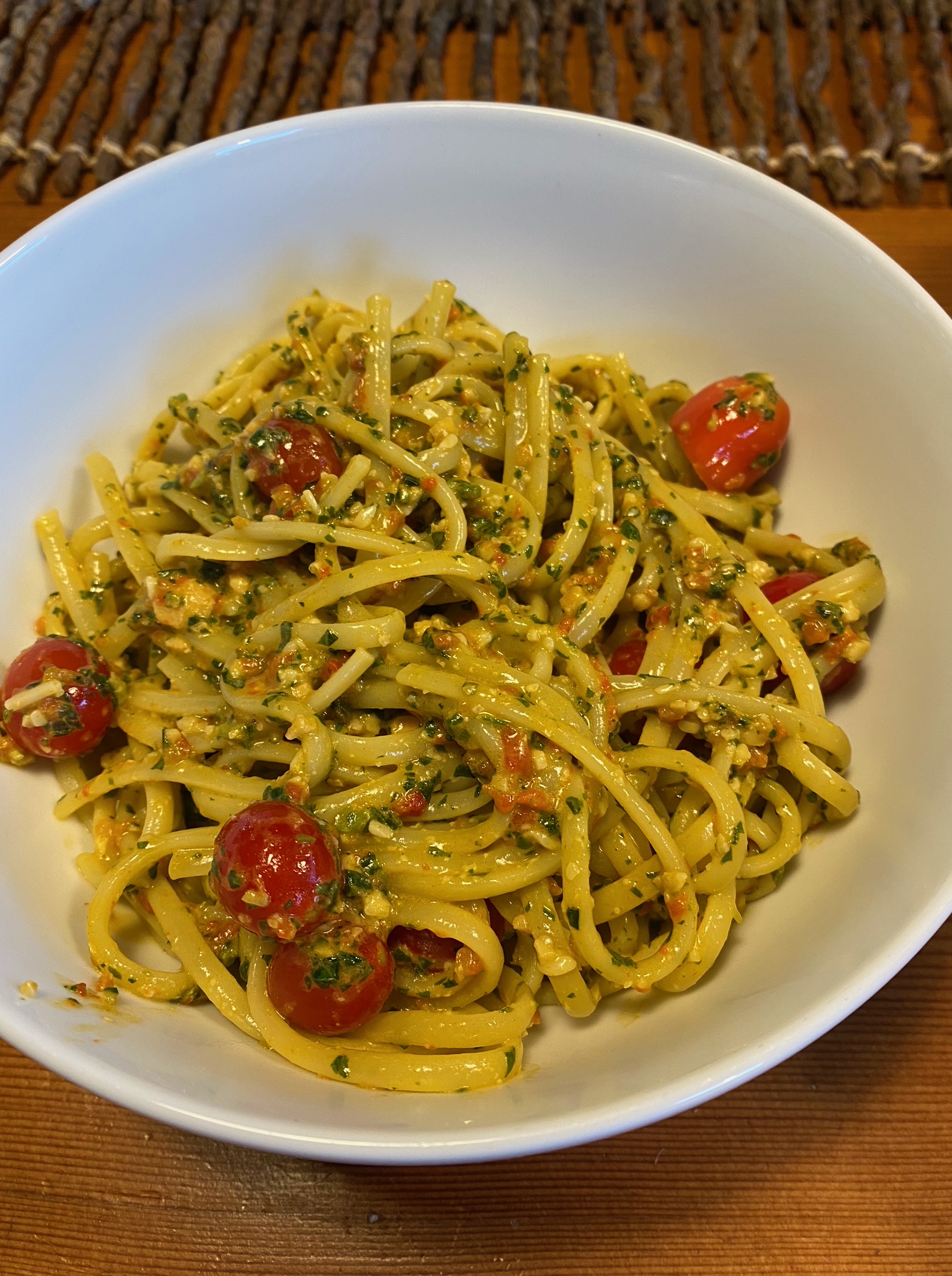 This is a use-what-we-have to make dinner creation that is both simple and very tasty. We had a great deal of basil on hand and some jarred roasted peppers that allowed us to combine some ideas from our basil pesto recipe with the red pesto pasta recipe – both of which we love. This can be made with almost any type of pasta, but we used linguine because, well, that’s what we had on-hand. It is easy enough to make this recipe vegan by substituting the parmesan with nutritional yeast.