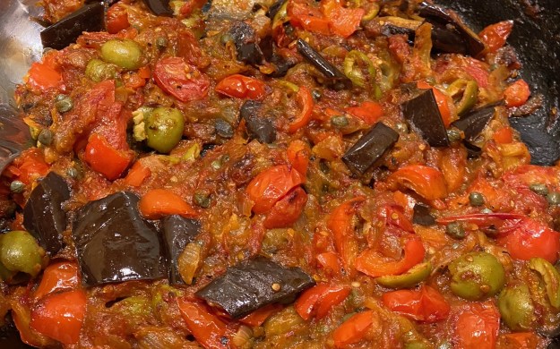 For this you’ll need: 1 large eggplant (cut into 1/2″ strips lengthwise), 1 red bell pepper (cored and cut into 1/2″ squares), 1 onion (chopped), 3 cloves garlic (crushed and chopped), 1 lb ripe tomatoes (stem core removed and halved), 1 cup cherry tomatoes (cut in half) 3 Tbs capers, 3 Tbs olives, 2 Tbs sugar (plus an extra pinch), 3 Tbs red wine vinegar, olive oil, dried basil, salt and pepper to taste.