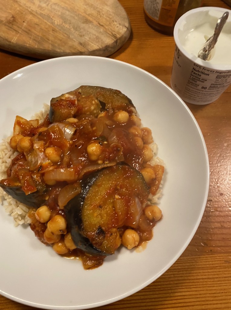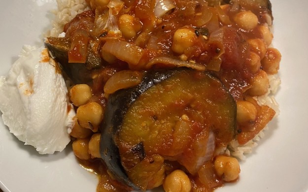 For this you’ll need: x2 eggplants (preferably Japanese if they are available, but any small version will do – cut into 1/2″ thick cubes or slices), 1 white onion (peeled and chopped), 1 tsp cumin seed, 1 tsp mustard seed, 1/2 tsp coriander seed, 1/2 tsp garam masala, 1 tsp salt, x1 14.5 oz can of chickpeas (don’t drain), x1 14.5 oz can of diced, fire roasted tomatoes, olive oil.