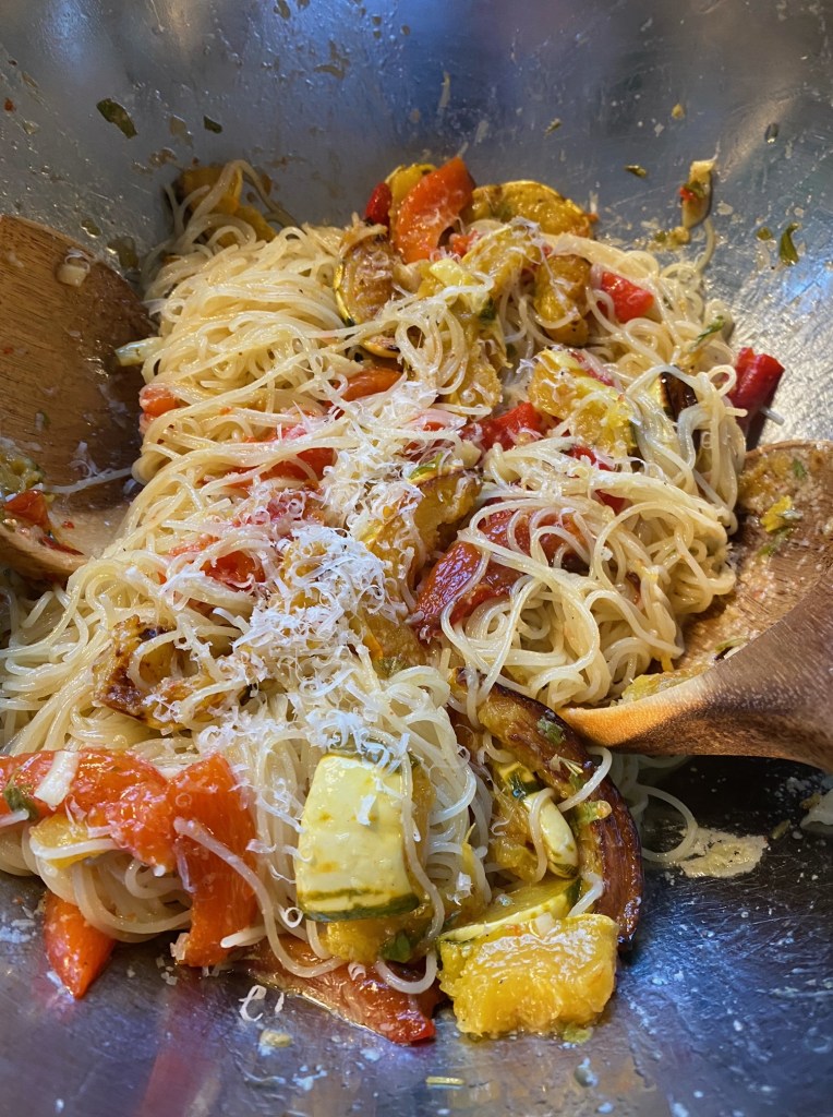 Once your pasta is cooked, drain it and reserve about 1 cup of the liquid. Place the pasta into a large serving bowl and add the heated oil directly from the pan and the roasted vegetables from the tray (use a rubber spatula on both in order to get all of the oil and juices into the serving bowl). Add the grated parmesan and about 1/2 cup of the reserved pasta water and toss, gently but well. If you want your sauce to be a bit more loose, add more pasta water – if you want it to be a bit more tight, add more parmesan.