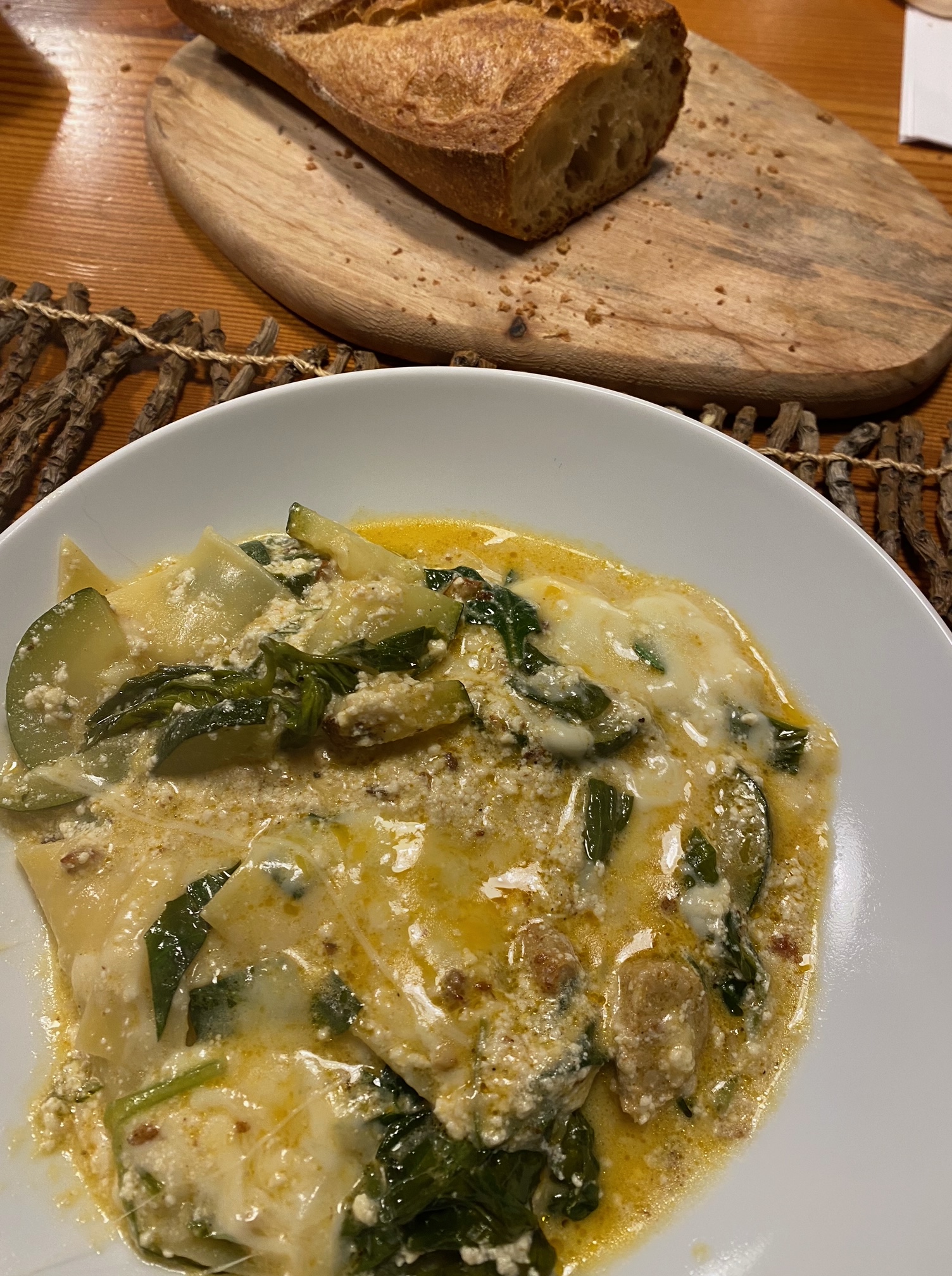 This comes from Ann Maloney in the Washington Post and it was as easy to make as it is tasty and satisfying. The addition of a bit of nutmeg gives a uniqueness to the flavor profile, and we experimented with ricotta and mozzarella in the “creamy sauce”. All of it is made in the same skillet with the sauce being mixed in a separate bowl. We used zucchini and Beyond sausage, but you could really add just about anything – leeks, red peppers, carrots, ground beef, etc.