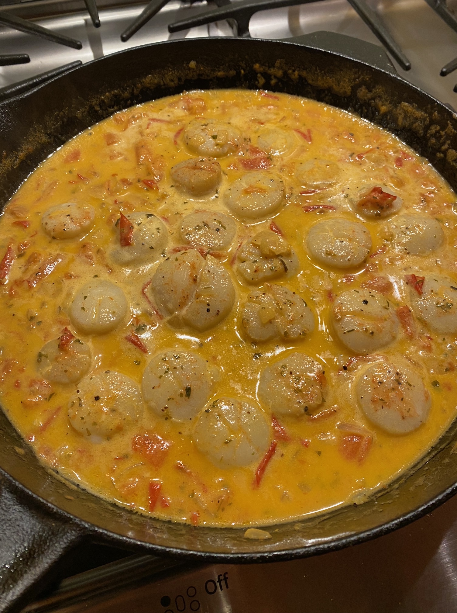 For this you’ll need: 1-1/2 lbs scallops, 2-3 shallots (peeled and thinly sliced), 1/2 tsp celery seeds, 2 cups tomatoes (fresh, chopped), 1/2 cup dry white wine, 4 tsp Worcestershire sauce, 1 cup heavy cream, 1/2 cup chives (fresh, chopped), 2 Tbsp unsalted butter, salt, pepper.