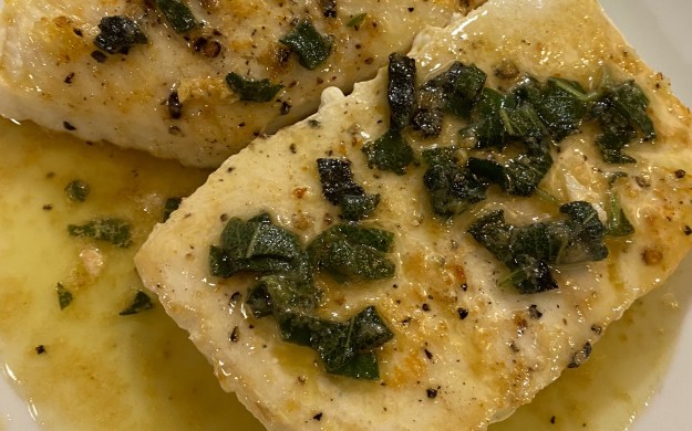 For this you’ll need: 1-2 lb halibut fillets, 3 Tbs fresh sage (stems removed and roughly chopped), 4 Tbsp unsalted butter, 1 Tbsp lemon juice, 1 Tbsp bread crumbs, salt, pepper, olive oil.