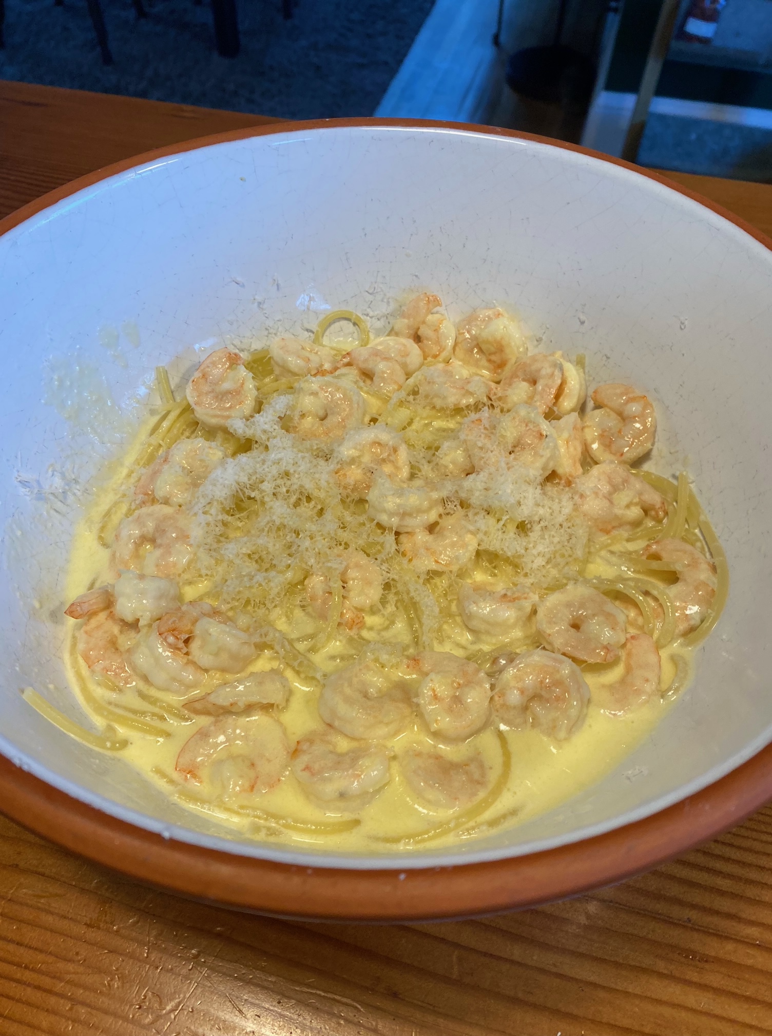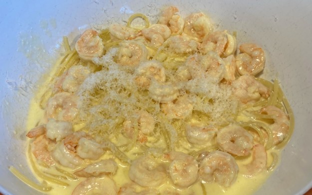 For this you’ll need: 1-1/2 cup heavy cream, 1 egg yolk, 2 Tbsp butter, 1 clove garlic (crushed and chopped), 1 cup grated parmesan cheese, 1/2 to 1 lb spaghetti, 1/2 lb shrimp (defrosted, if frozen, peeled and deveined), pepper.