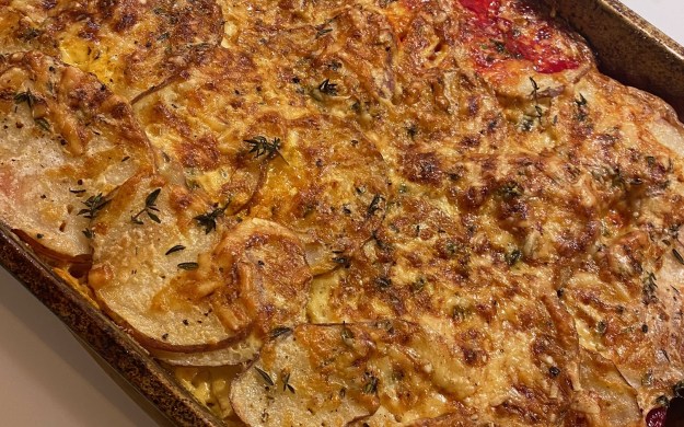 In order to fill a 9′ x 13″ pan, you’ll need: FOR THE CREAM: 3-4 cups half & half, 3 Tbs unsalted butter, x2 large chopped shallots, 1 Tbsp whole black peppercorns, 6 cloves garlic (finely chopped), 6 bay leaves (whole), 3 thyme sprigs (fresh), 1/2 tsp grated nutmeg, 2 egg yolks, salt and pepper. FOR THE VEGGIES: 2-3 Large red/russet potatoes (not peeled), 3-4 large red beets (peeled), 1 large or 2 medium sweet potatoes (peeled), 1/2 large or 1 small butternut squash “necks” (peeled), 10-16 oz gruyere cheese (grated), fresh thyme, salt and pepper.