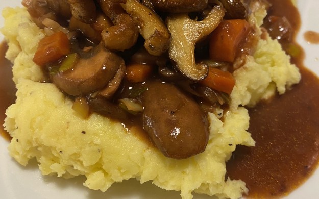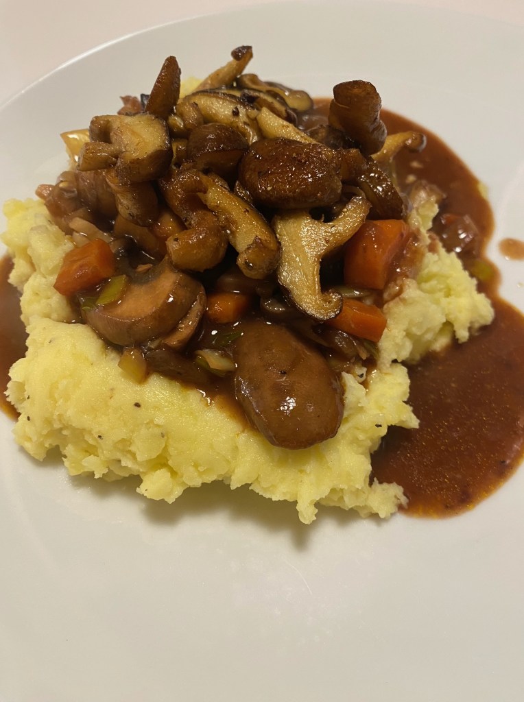 Mash some potatoes or cook some polenta and create a simple bowl shape with them on a plate. Add the final remaining chopped garlic clove to the mushroom mixture and stir well. Turn off the heat and season with salt and pepper to your liking (you can also add another splash of the soy sauce if needed). Spoon the mushroom mixture over the top of your potato/polenta “bowl” and then add your browned mushrooms over the top. Serve immediately.