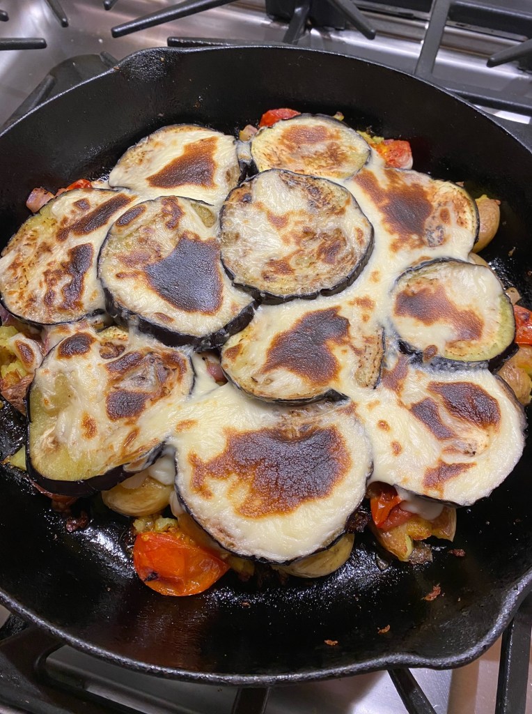 Add another good glug of olive oil into the same cast iron skillet you cooked the eggplant in. Place the boiled potatoes into the oil and gently smash them with the back of a wooden spoon or the side of a large knife so that they spread out across the bottom of the pan but they are not mashed. Add in good grindings of salt, pepper and a handful of chopped, fresh oregano and sage. Cook over medium heat until the potatoes are beginning to brown on one side, 3-5 mins. Toss them or turn them over and cook on the other side – again seasoning them with salt and pepper. Once the potatoes are browned on both sides, spoon the roasted tomatoes and onion over the top. Add about 1/2 of the Béchamel Sauce and another good dose of salt, pepper and some more herbs. Top this with the grilled eggplant slices and add the remaining Béchamel Sauce over the top.