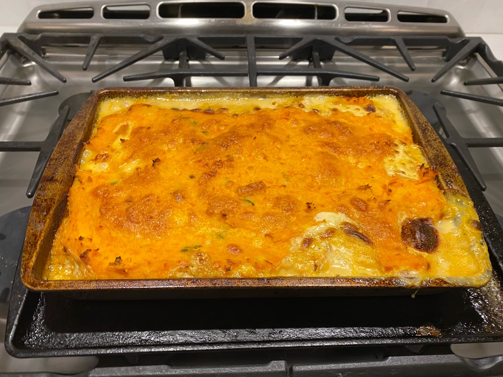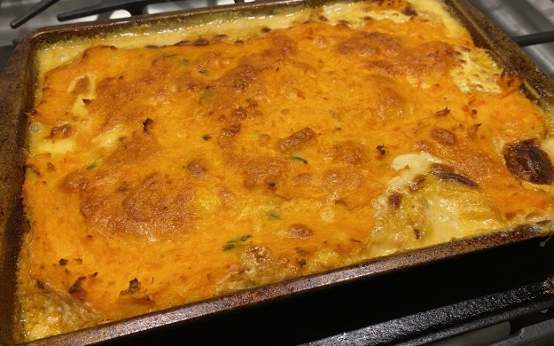 Add the mashed potato mixture in large dollops equally across the top of the seafood/veggie/cream mixture. With the back of a wooden spoon, gently spread the mashed potatoes evenly across the entire surface. Sprinkle a bit more cheese across the top and place into the preheated oven. Bake until golden and bubbling – about 25 mins.