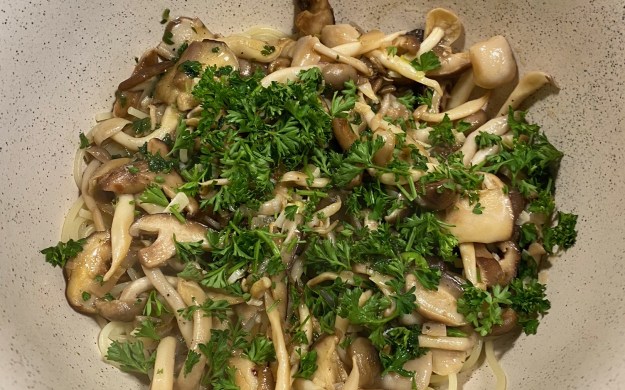 For this you’ll need: 4+ cups mixed mushrooms (roughly chopped), 2 Tbsp unsalted butter, 3 Tbsp olive oil, 4 cloves garlic (chopped), 1 shallot (thinly sliced), 1/2 cup white wine, 1/2 cup vegetable stock, 1/2 tsp crushed red pepper, 1/2 tsp salt, 3 Tbsp lemon juice, 1/2 cup parsley (chopped), 1/2 lb pasta (spaghetti), pepper.